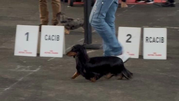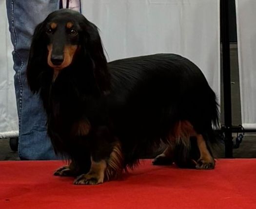 36CM. EXCELLENTE FOURRURE - DE LA LONGUEUR. NOIR ET FEU. FEUX INTENSES. LA TETE EST EXPRESSIVE. OEIL FONCE. ENCOLURE DEGAGEE. BIEN CONTRUITE. EXC OSSATURE. EXC POITRINE. DOS FERME ET TENDU. EXC ALLURES